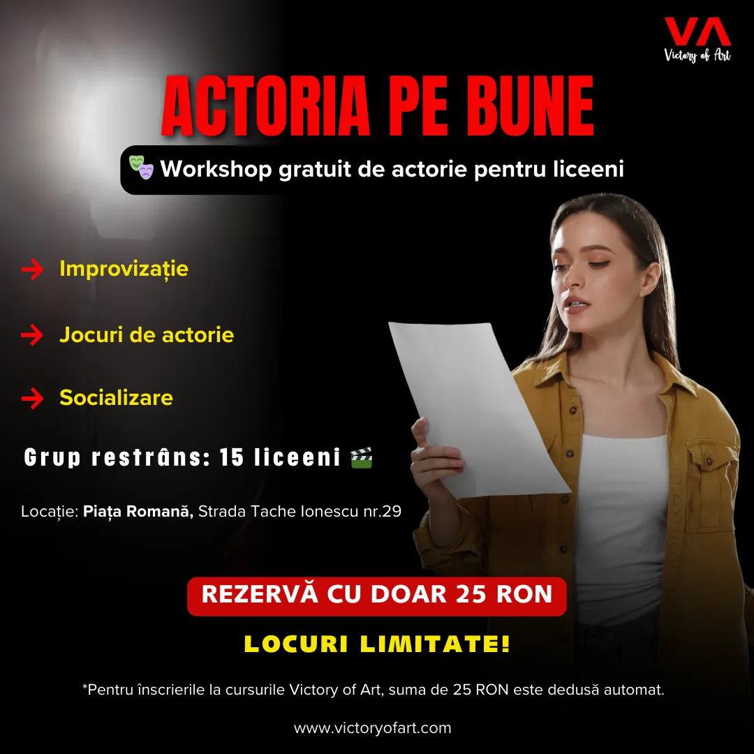 Ziua cea mare în care te așteptăm la Victory of Art pentru desfășurarea workshop-ului de actorie.